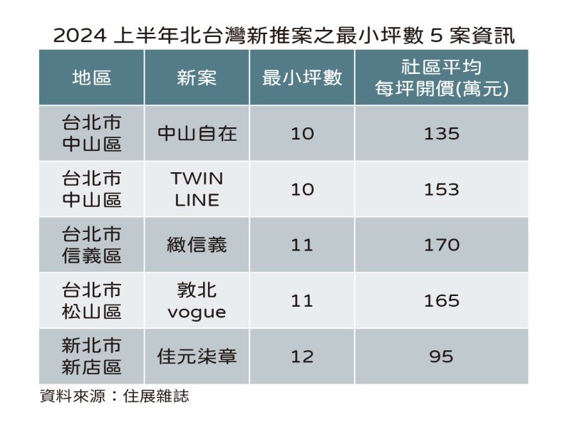 當前房市熱潮表現在小宅上,民眾負擔不起高總價,只能屈就坪數,住展雜誌彙整今年北台灣上半年推出的最小坪數新案,前五小當中有四皆在台北市,規劃出最小坪數僅10坪的是中山區兩案「中山自在」與「TWIN LINE」,最小11坪的則有信義區「緻信義」、松山區「敦北vogue」,最小12坪的是新北市新店區的「佳元柒章」。