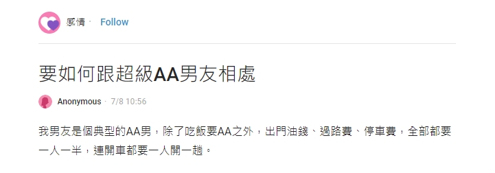 一名網友在Dcard以「要如何跟超級AA男友相處」為題發文,與男友交往2年,所有的開銷全都要一人一半,不僅如此,像是開車也要一人開一趟,甚至是連性生活的「動作」,也要公平才可以,沒想到她提出異議後,男友就改成接吻和抱抱就好,兩人開始過著無性生活。