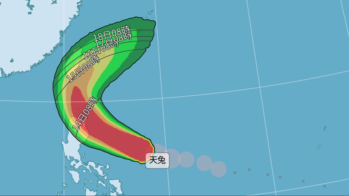 中央氣象署評估,天兔將在周五(15日)至周六(16日)最接近台灣。(圖/翻攝自氣象署)