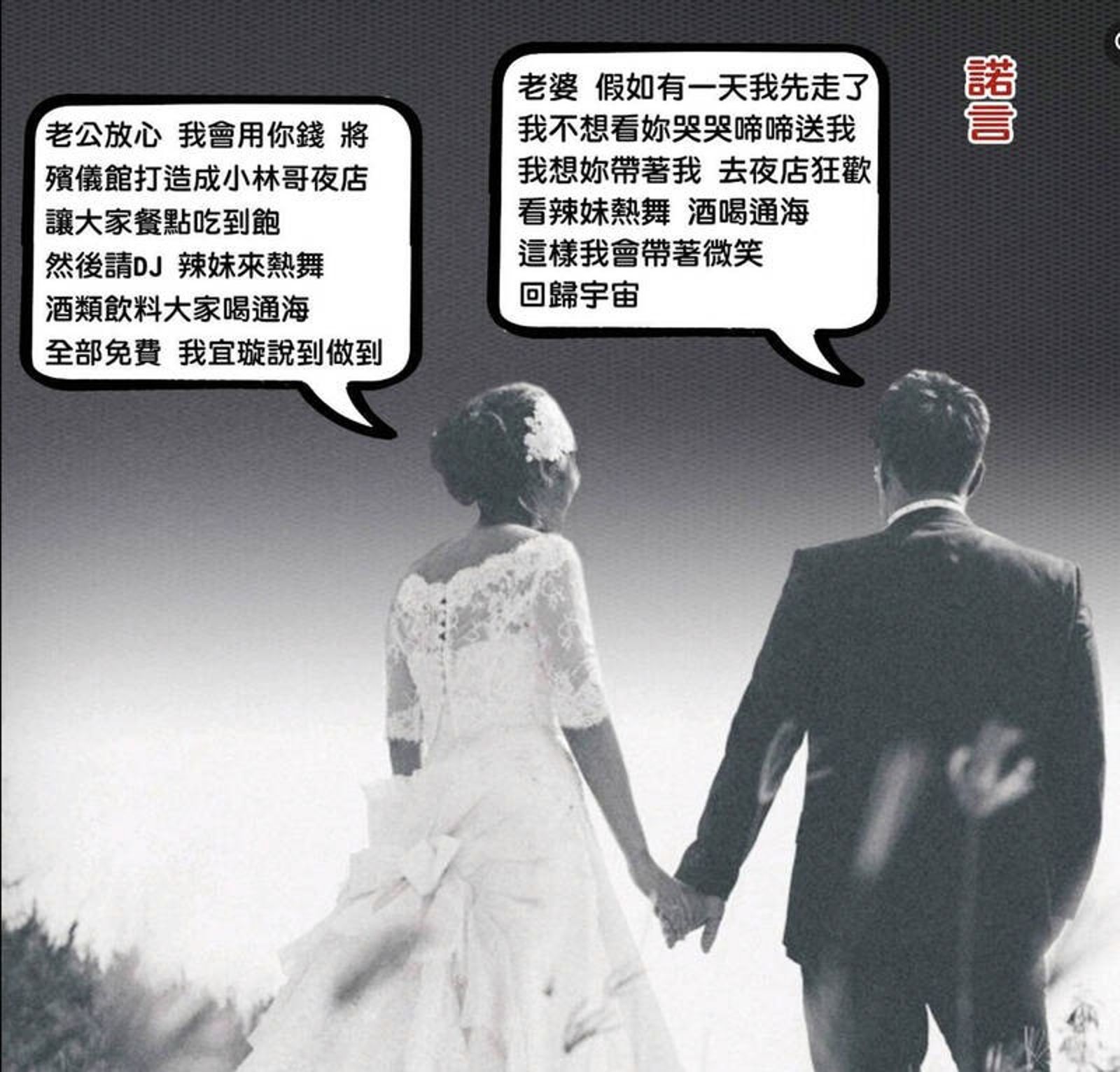 這組照片顯示,殯儀館大門被改裝成夜店看板,還標榜有辣妹入場,而且可以「飲酒、熱舞、聊故事」。就有網友直呼「很棒的告別方式」、「選擇自己喜歡的方式離開,沒有不好」、「真的變夜總會了」、「這是一場老婆對老公諾言的兌現」。