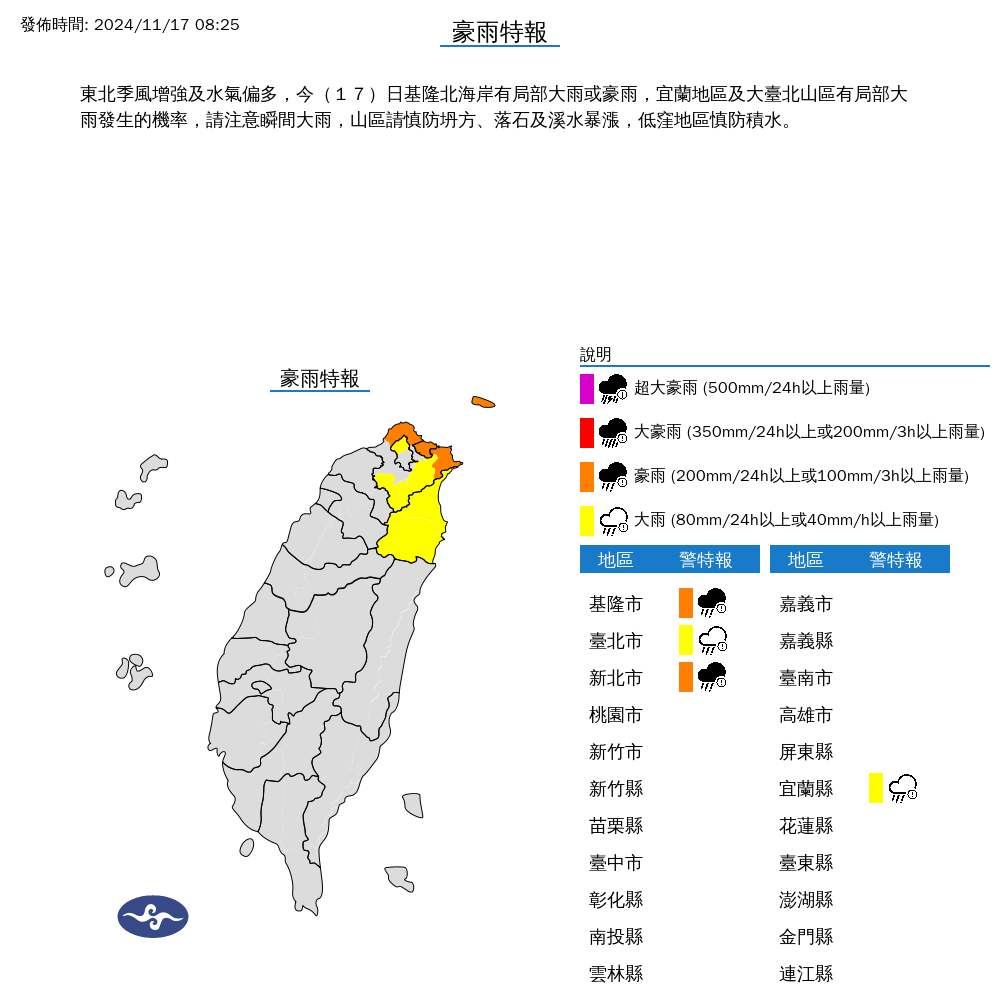 中央氣象署在今(17日)08:25發布4縣市豪雨、大雨特報。受到東北季風增強及水氣偏多,今日基隆北海岸有局部大雨或豪雨,宜蘭地區及大臺北山區有局部大雨發生的機率,請注意瞬間大雨,山區請慎防坍方、落石及溪水暴漲,低窪地區慎防積水。
