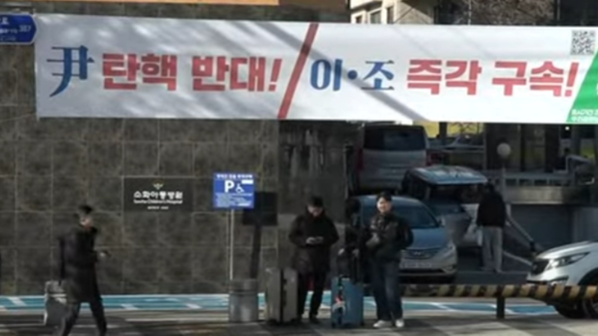 南韓首爾車站對面掛布條反對南韓總統尹錫悅的彈劾案。(圖/東森新聞)