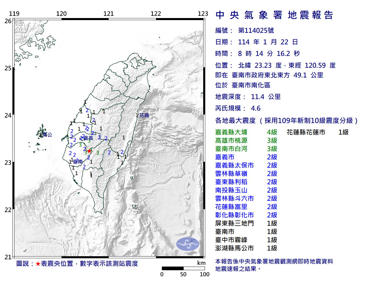 中央氣象署發布顯著有感地震最新消息,今(22)日8時14分,發生芮氏規模4.6有感地震,震央位置在臺南市政府東北東方 49.1 公里 (位於臺南市南化區),震源深度11.4公里。