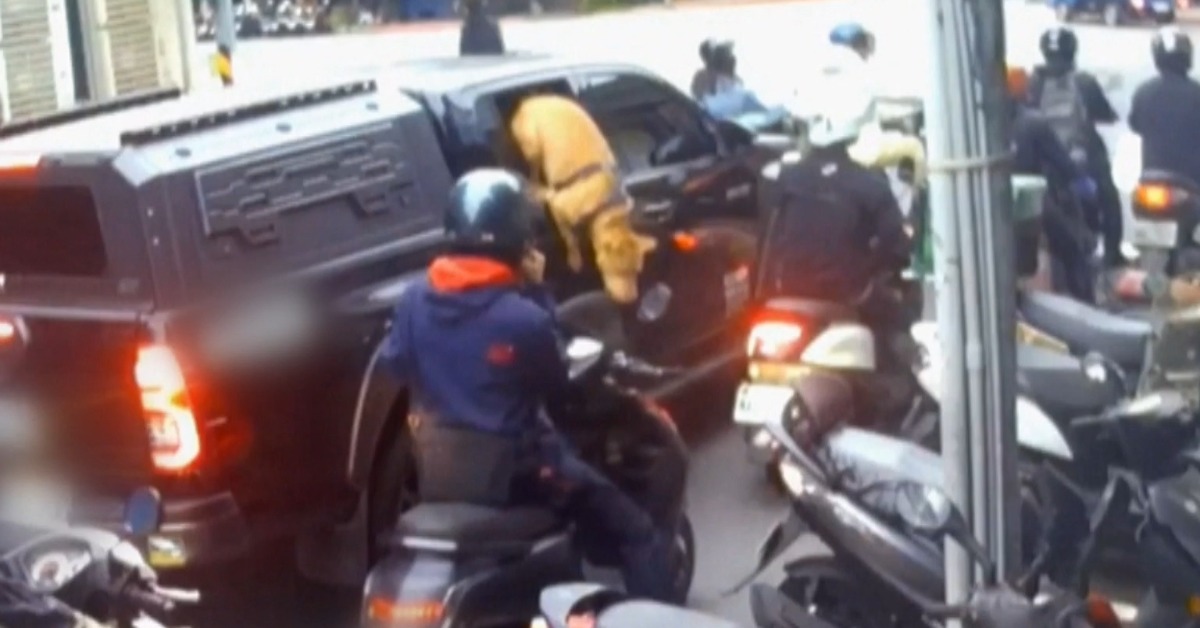 騎士在路口停等紅燈,一旁黑色汽車車窗緩緩降下,土黃色的比特犬突然跳出來,攻擊機車騎士,猛力咬住騎士的腿不放,騎士當場痛到在地上打滾。騎車小心再小心,還是沒想到會被犬隻攻擊。
