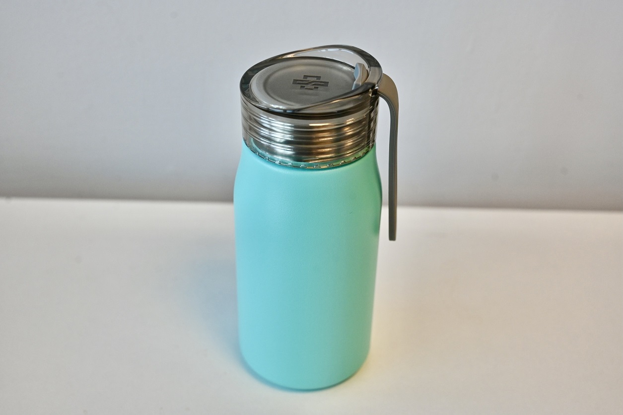 ▼中鋼今年度股東會紀念品「輕巧冷水瓶」,瓶身採極簡設計,杯蓋配置便攜矽膠提把。(圖/中鋼提供)