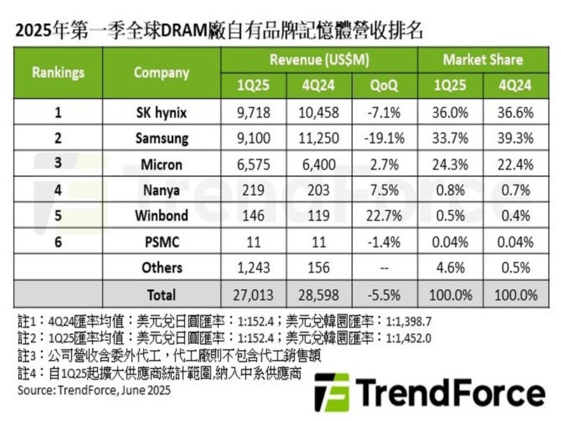 TrendForce: 25Q1 DRAM營收季減5.5% Samsung讓出寶座給SK hynix