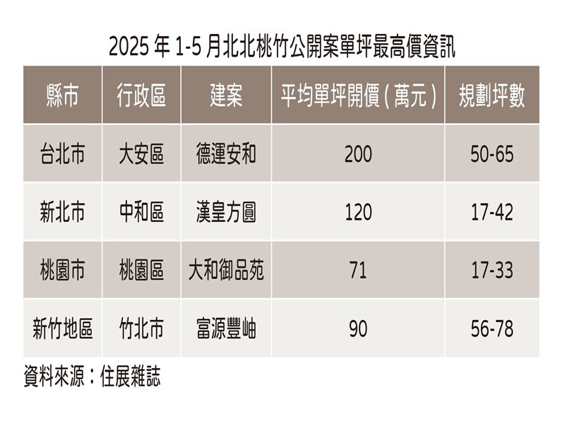 住展雜誌彙整今年一至五月北北桃竹亮相新案單坪開價最高資訊,台北市為大安區遠企商圈的「德運安和」,平均每坪200萬元;新北市則又有開出三位數案,乃中和區捷運永安市場站生活圈的「漢皇方圓」,平均單價120萬元;桃園市是鄰近藝文特區的「大和御品苑」,單坪均價71萬元;新竹地區為竹北市高鐵特區的「富源豐岫」,每坪平均價是90萬元,除了桃園市開價相對保守以外,台北市、新北市與新竹地區都算是維持一定水準。