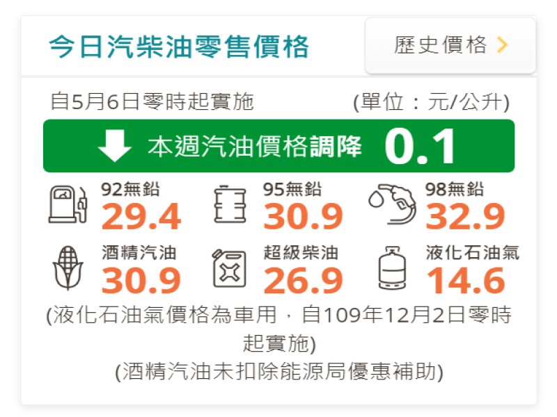 中油:明(6)日起國內汽、柴油價格各調降0.1元。(翻自官網)
