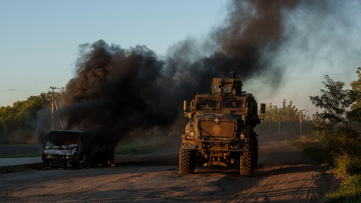 路邊一輛俄軍坦克被大火燒得精光,一旁還有烏軍得意地乘坐坦克經過。烏克蘭的反攻行動已經持續到庫斯克村莊第八天,當地到處都是轟炸過後的痕跡。這次的奇襲顯然相當成功,連烏克蘭電視台記者都能深入俄羅斯領土進行採訪。