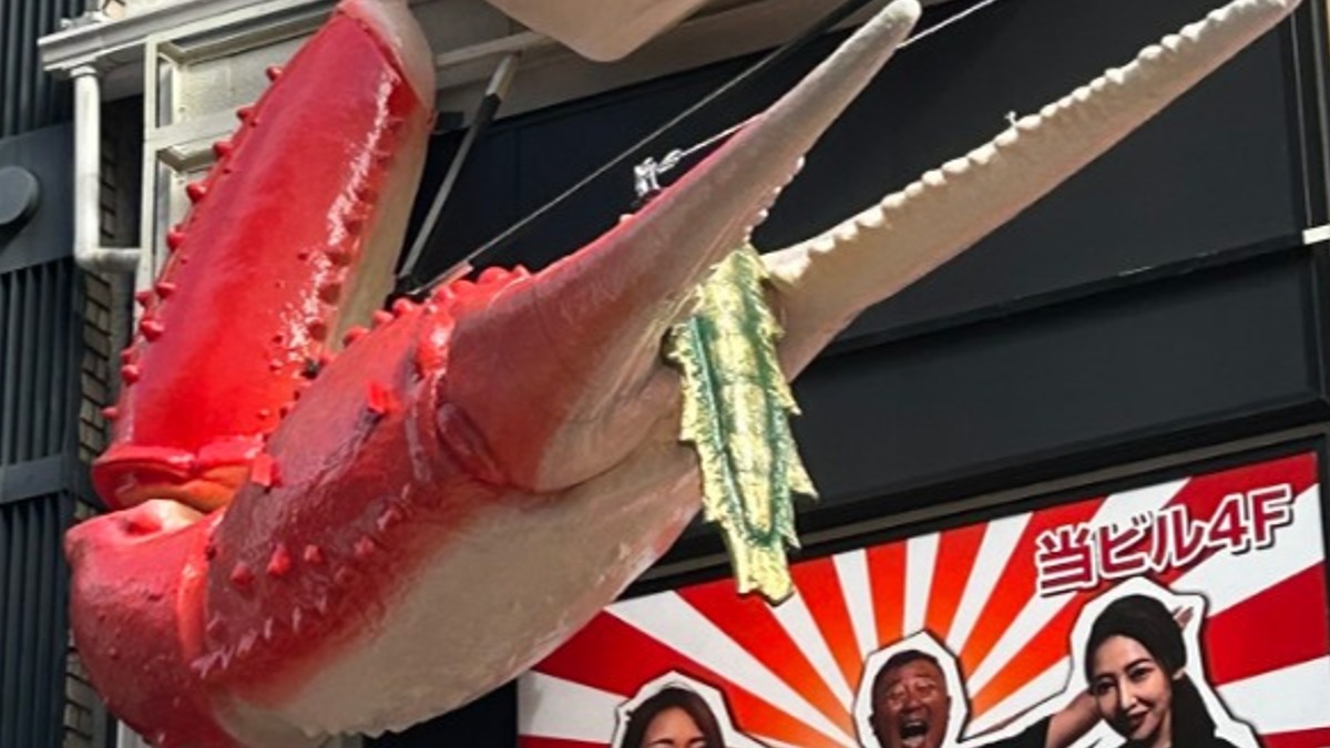 走在日本大阪著名的道頓堀商店街,沒想到抬頭一看,街道上最醒目的立體螃蟹招牌的螯竟夾著一條尾巴,吸引民眾前來觀看。