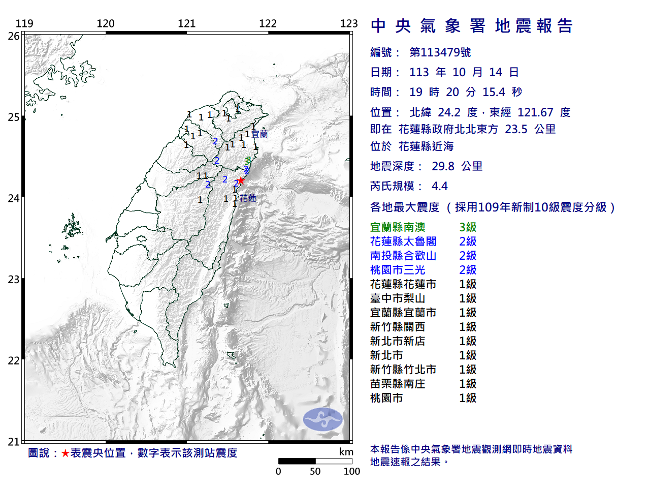 中央氣象署發布顯著有感地震最新消息,今(14)日19時20分,發生芮氏規模4.4有感地震,震央位置在花蓮縣政府北北東方 23.5 公里 (位於花蓮縣近海),震源深度29.8公里。