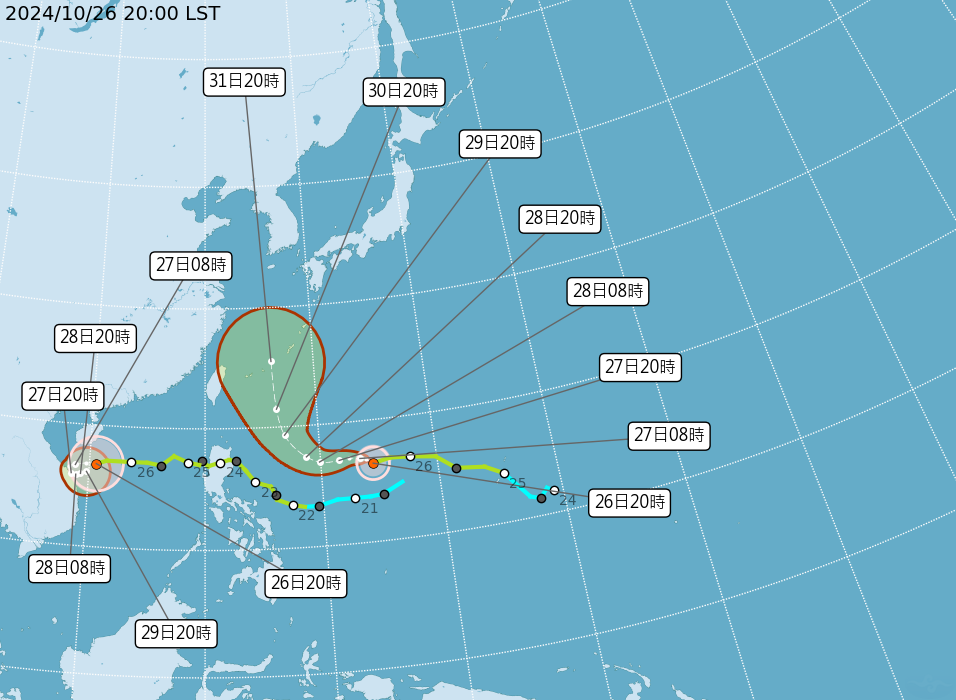 輕颱康芮路徑西修,對台威脅加劇。中央氣象署指出,康芮下周一、二(28日、29日)的北轉時間及位置,將是影響台灣的關鍵,如延後北轉,對台影響較明顯,且有機會增強為中颱。另下周三至下周六(30日至11月2日)北部、東半部都有降雨,溫度也會下降。