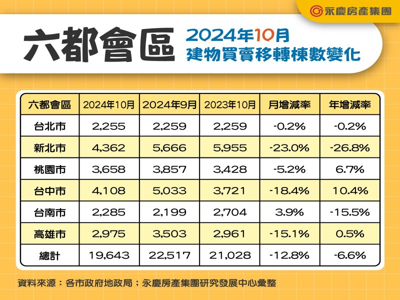 另與去年同期相比,2024年10月六都建物買賣移轉棟數年減6.6%,其中,六都表現增減互見,台北市年減0.2%,新北市年減26.8%,桃園市年增6.7%,台中市年增10.4%,台南市年減15.5%,高雄則是年增0.5%。