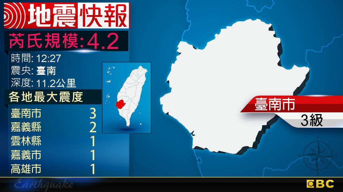 中央氣象署發布顯著有感地震最新消息,今(19)日12時27分,發生芮氏規模4.2有感地震,震央位置在臺南市政府北方 23.5 公里 (位於臺南市麻豆區),震源深度11.2公里。