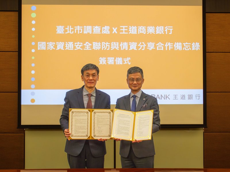 為響應政府推動「資安即國安」國家戰略政策,王道銀行(O-Bank)於13日由李芳遠總經理代表,與法務部調查局臺北市調查處洪慶裕處長共同簽署「國家資通安全聯防與情資分享合作備忘錄(MOU)」,攜手推動資安聯防生態系並藉資安情資共享與防禦互助,持續強化數位金融資安聯防能力,確保金融交易穩定性與安全性。