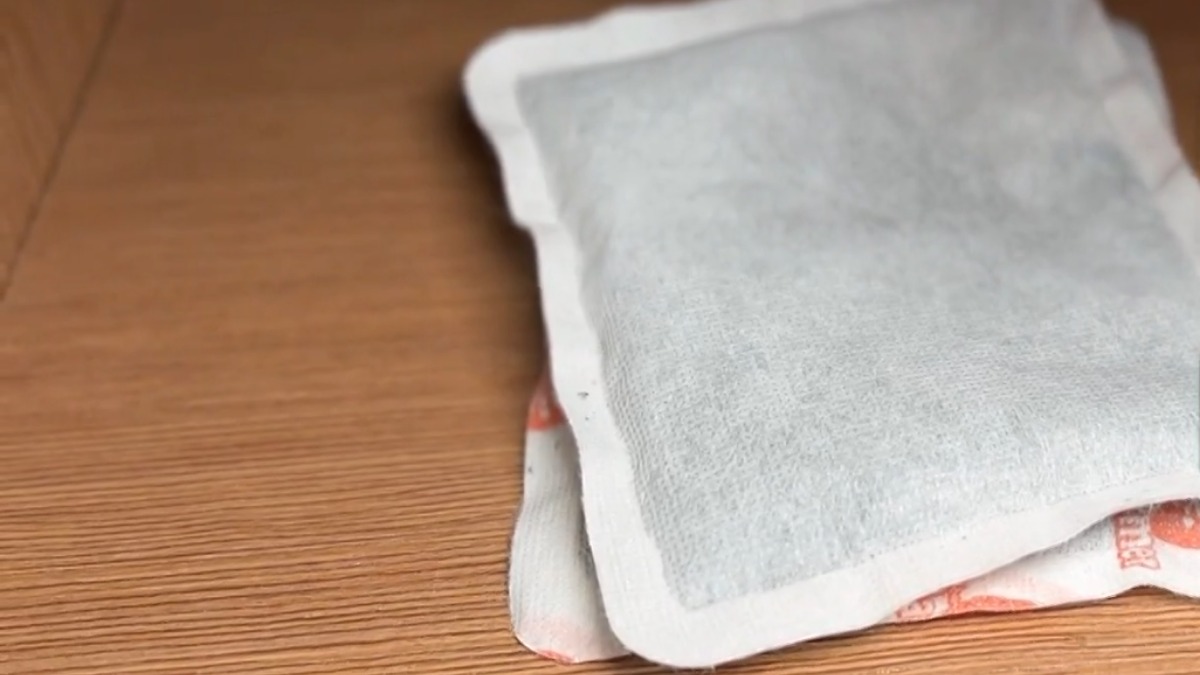 暖暖包裡面含有天然礦物「蛭石成分」,可吸水保濕,幫助降低櫥櫃濕度。(圖/東森新聞)