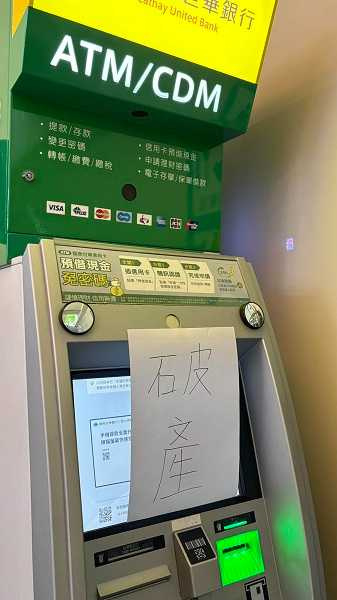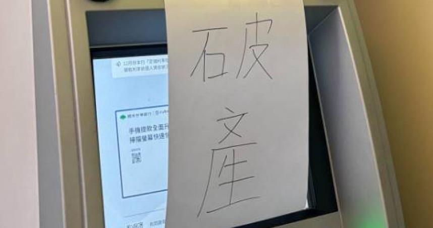 畫面可見,ATM上面貼了一張紙,寫著斗大的「破產」2字,雖然機器螢幕還亮著,但裡面沒有鈔票,無法提供顧客服務。
