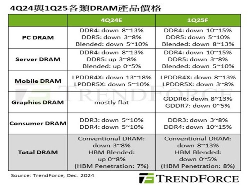 根據TrendForce最新調查,2025年第一季進入淡季循環,DRAM市場因智慧手機等消費型產品需求持續萎縮,加上筆記型電腦等產品因擔心川普上任後可能拉高進口關稅的疑慮,已提前備貨,進而造成DRAM均價下跌。其中,一般型DRAM(conventional DRAM)的跌幅預估將擴大至8%至13%,若計入HBM產品,價格預計下跌0%至5%。