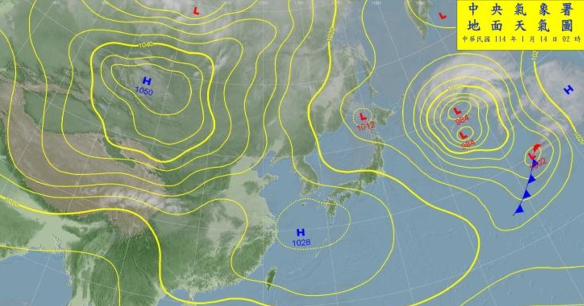 今(14日)晚間起冷氣團南下加上南方雲系北移,半個台灣有雨。