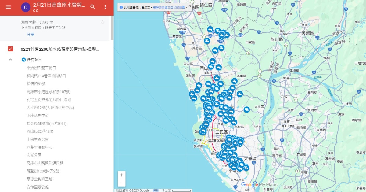 此外,台水公司也設置150個加水站,並彙整在Google地圖上,只要一點就能知道附近有沒有加水站,詳細名單點我。