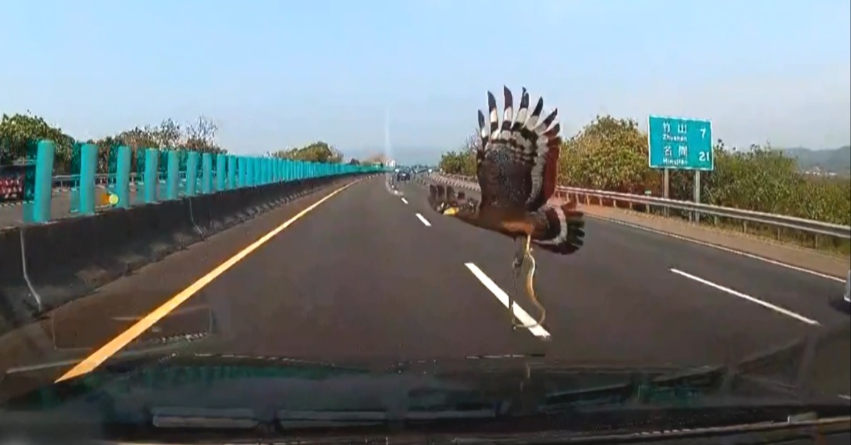 一名駕駛在在國道開車時,竟然跟一隻抓著蛇正在飛的的老鷹迎面對撞。(圖/東森新聞)