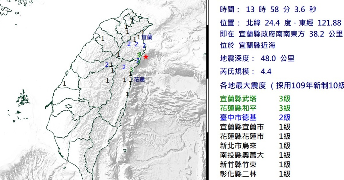 宜蘭縣近海今(14日)下午13時58分,發生芮氏規模4.4地震,深度48公里。各地最大震度為宜蘭3級、花蓮和平3級、台中德基2級;宜蘭、花蓮市、新北烏來、南投奧萬大、新竹竹東、彰化二林1級。