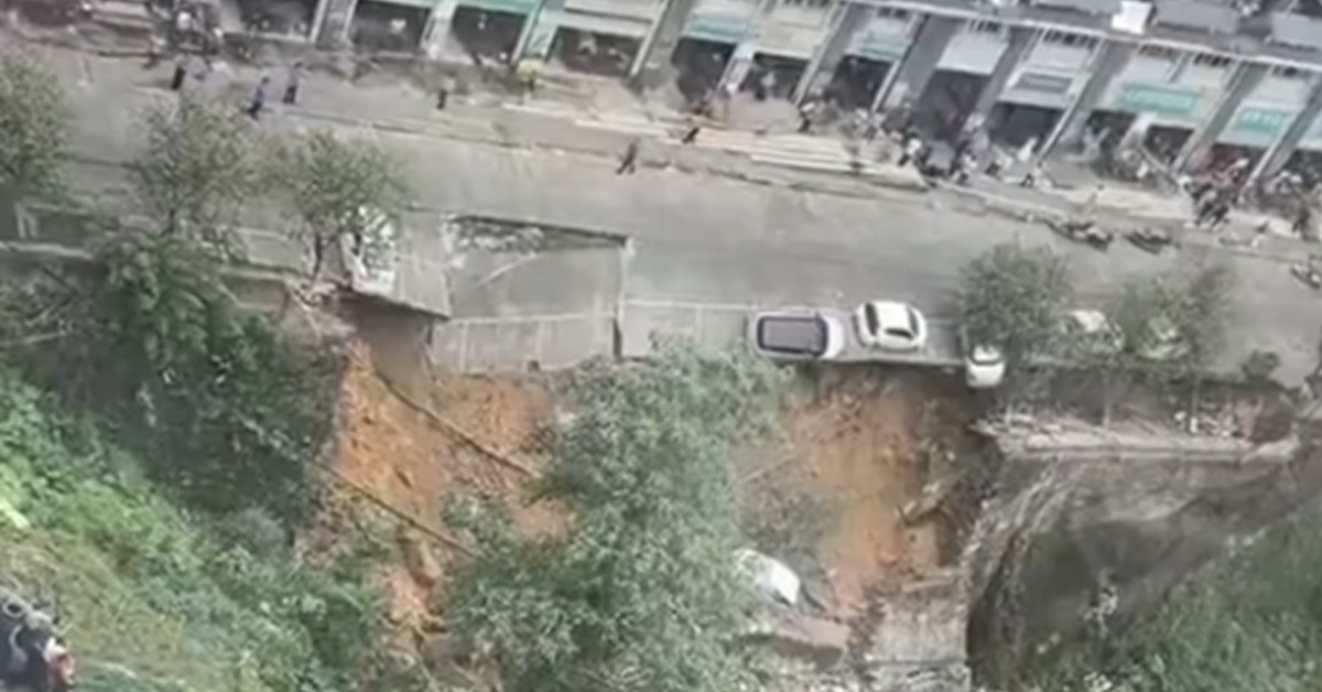 網路上流傳一段影片,廣西柳州一處公路發生坍塌,如今僅剩懸空的柏油路面,停放在路邊的4輛轎車也接連滾落。