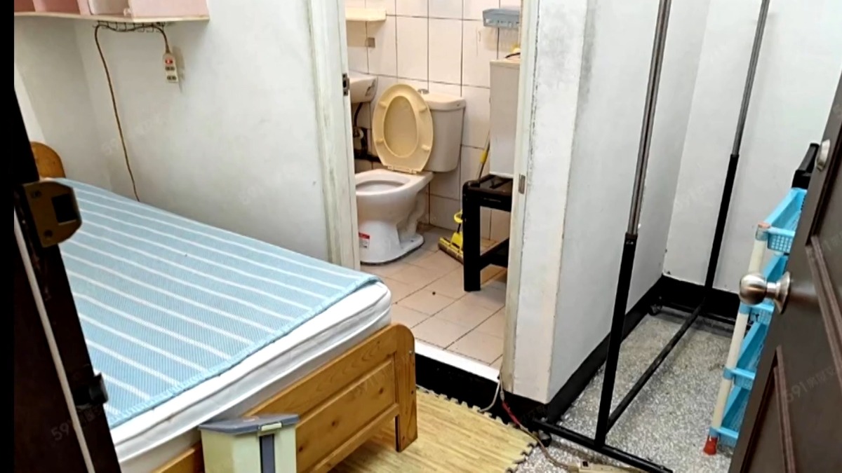 整排老屋門窗都長滿鐵銹,周遭荒涼人煙稀少,在內湖這樣的地方,還出現了4坪租屋,擁擠的套房只塞得下一張單人床,和一個曬衣架,仔細看,床幾乎就是睡在廁所門口,空間超窄,雜物堆到不夠放,冰箱甚至還得直接擺進廁所裡。