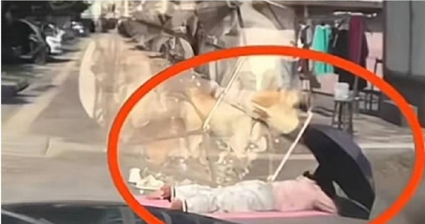 女子在路上鋪著瑜伽墊,撐著遮陽傘悠閒的在路上趴著曬背,結果被一輛經過的汽車撞上。(圖/翻攝自微博/CTWANT)