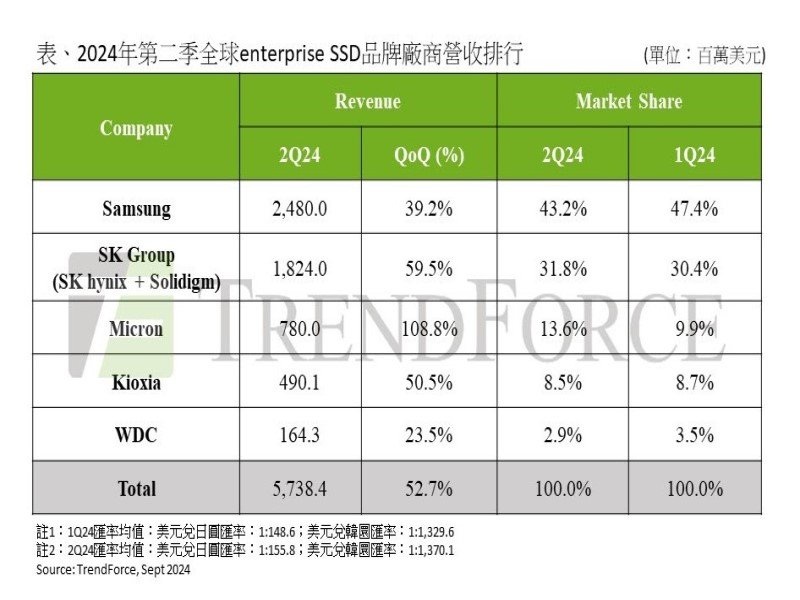 TrendForce指出,第三季由於更多NVIDIA GPU到貨,CSP持續增加enterprise SSD採購,加上Samsung的PCIe 5.0產品逐步通過客戶驗證並開始放量,預期該公司的獲利率將成長,營收有望季增20%以上。