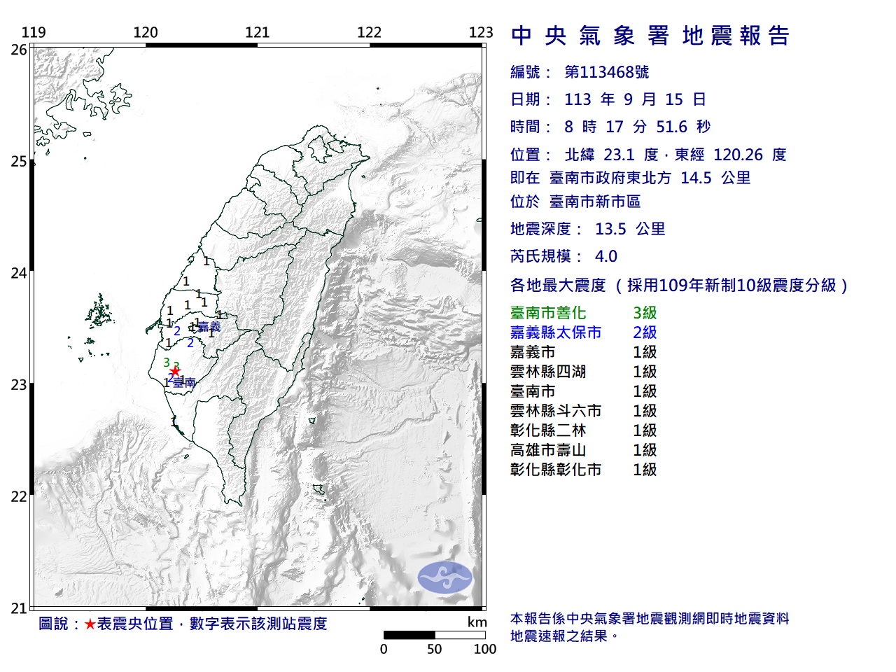 中央氣象署發布顯著有感地震最新消息,今(15)日8時17分,發生芮氏規模4.0有感地震,震央位置在臺南市政府東北方 14.5 公里 (位於臺南市新市區),震源深度13.5公里。