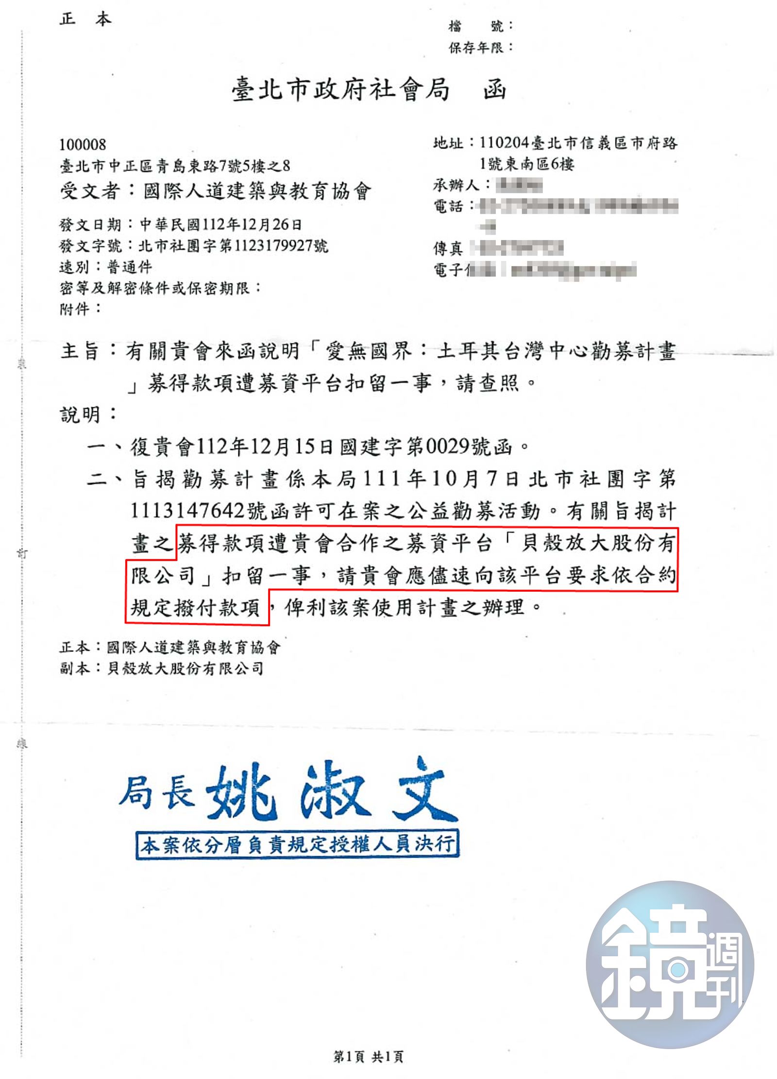 北市社會局去年底曾函請發起募款的國際人道建築與教育協會,儘速向貝殼放大要求依約撥付款項。(圖/讀者提供/鏡週刊)