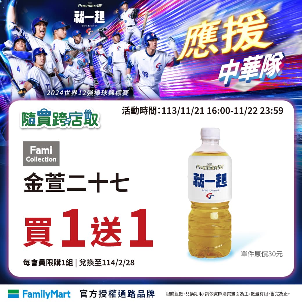 即日起至11月22日,凡至全家門市購買「金萱二十七」,即可享買1送1優惠。(圖/翻攝自全家臉書)