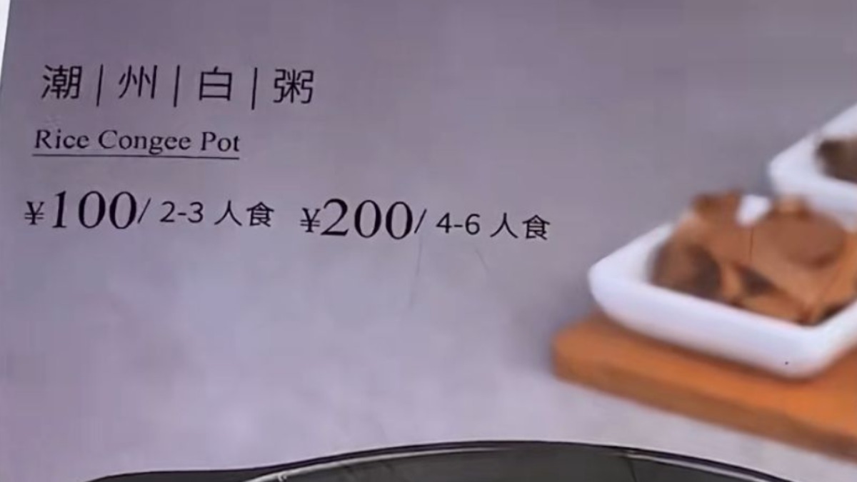 近日,一名網友到上海一間潮汕特色餐廳吃飯,看見菜單上一鍋粥2至3人份100(約新台幣430元)、4至6人份竟要價200元人民幣(約新台幣860元),於是好奇的點來吃了;沒想到送上來之後竟然真的就是一鍋白粥,送的普通鹹菜還不能續,讓網友當場發問「這米是有什麼特別的地方嗎」。