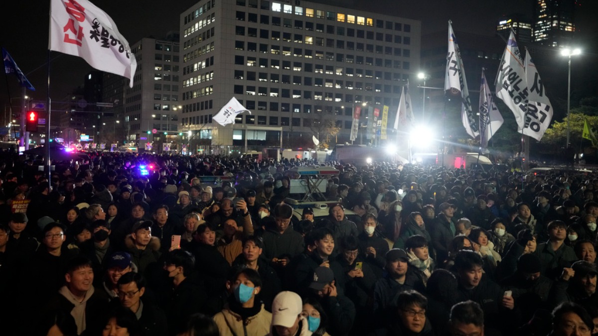 大批民眾聚集在南韓國會外頭,大喊要把總統尹錫悅趕下台。(圖/美聯社)
