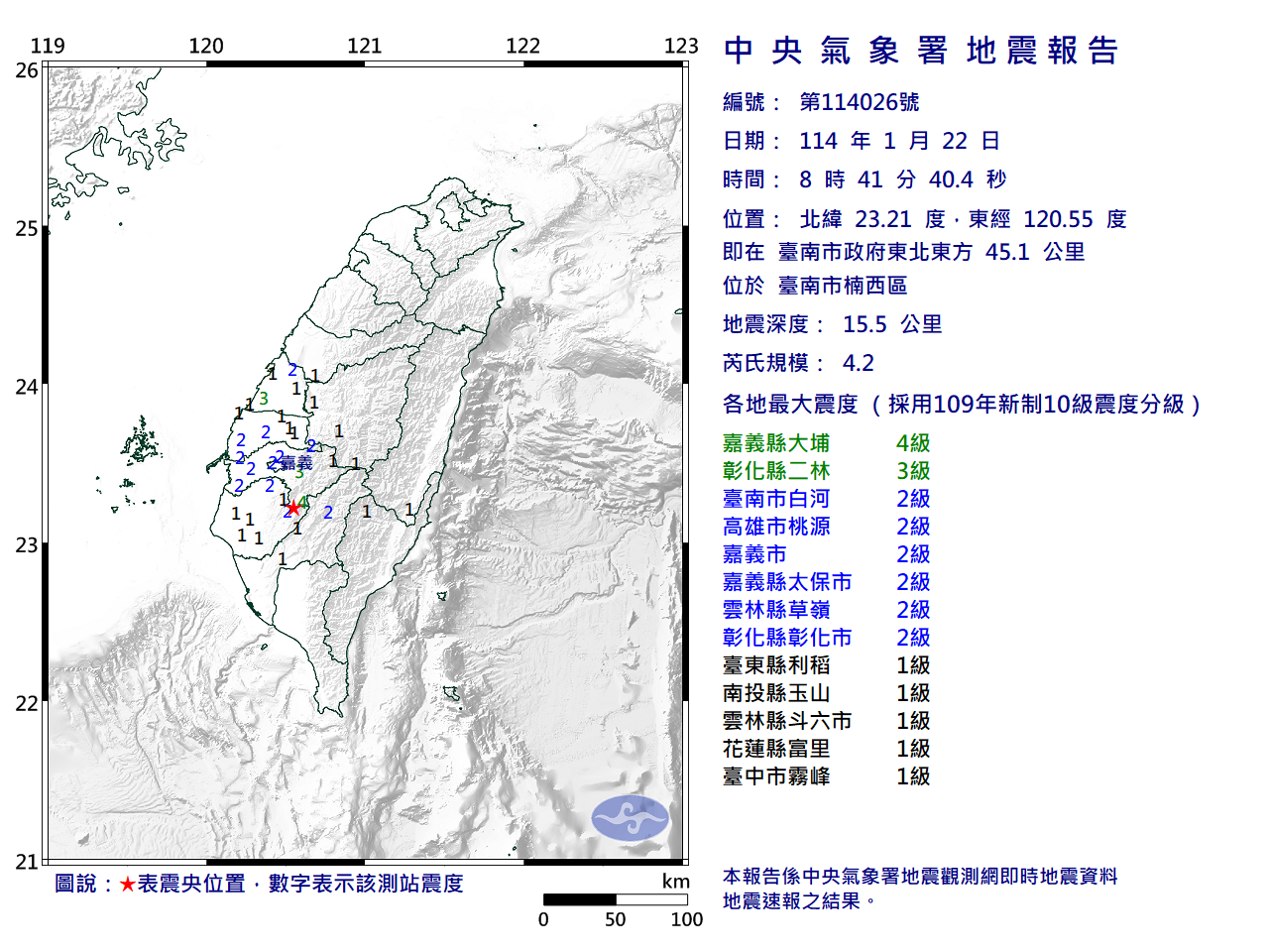 中央氣象署發布顯著有感地震最新消息,今(22)日8時41分,發生芮氏規模4.2有感地震,震央位置在臺南市政府東北東方 45.1 公里 (位於臺南市楠西區),震源深度15.5公里。