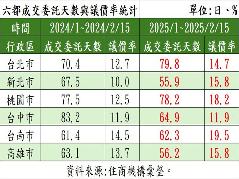 自2024年下半年起全台交易量重挫,這也反映到議價率上,住商機構觀察內部資料,比較六都成交天數與議價率變化,其中若分析去年同期數據,六都除台中維持平盤之外,其餘五都議價率上揚。大家房屋企劃研究室公關主任賴志昶分析,近期交易量明顯趨冷,房市漸往買方市場傾斜,致使主要熱區皆出現議價率增加趨勢。