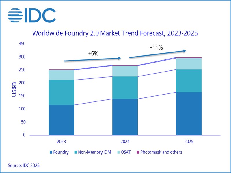 根據IDC(國際數據資訊) 「全球半導體供應鏈 追蹤情報 」最新研究顯示,全球半導體市場在經歷2024年的復甦之後,預計在2025年迎來穩健成長。廣義的晶圓代工2.0 (Foundry 2.0) 市場,包括晶圓代工、非記憶體IDM、封裝測試以及光罩製作,在AI需求持續增長以及非AI需求緩步回溫的催化之下,預計2025年市場規模將達2,980億美元,年成長11%。