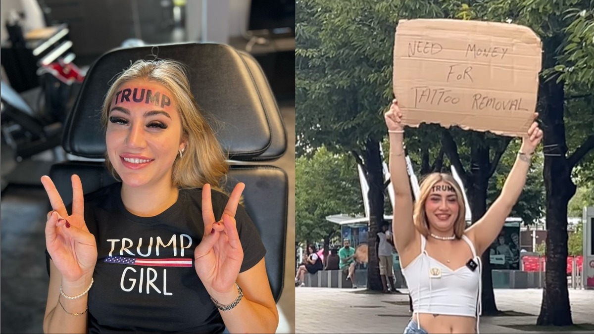 英國21歲網美孟羅,是美國前總統川普的瘋狂粉絲,一個月前她在額頭刺上「TRUMP」大寫英文字母表達對川普的支持,但在網路上卻被惡搞讓她相當後悔,雷射移除刺青需要約新台幣16萬元,她只好上街頭舉牌募資。