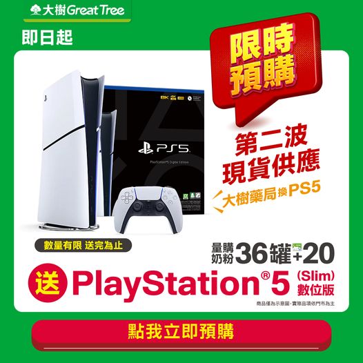 大樹藥局日前舉辦「換PS5」活動,購買「36罐奶粉 + 20盒營養品」,填寫 Google表單並上傳發票即可兌換「PlayStation®5 (Slim) 數位版」,限量10台再短短3小時就秒殺,引發熱烈討論。昨日大樹藥局又祭出第二波預購活動,將在11月25日起陸續出貨,臉書粉專還打趣道「還有要救援的老公嗎」,標註「男人的空氣濾淨器」。