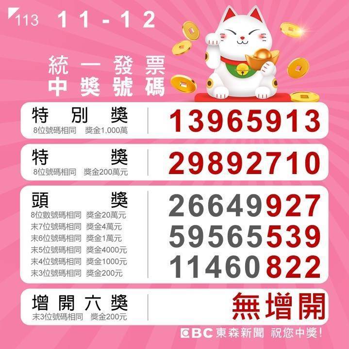 根據財政部官網顯示,113年11、12月統一發票特別獎號碼(新台幣1000萬元)13965913;特獎號碼(200萬元)29892710,頭獎號碼(20萬元)3組分別為26649927、59565539、11460822。