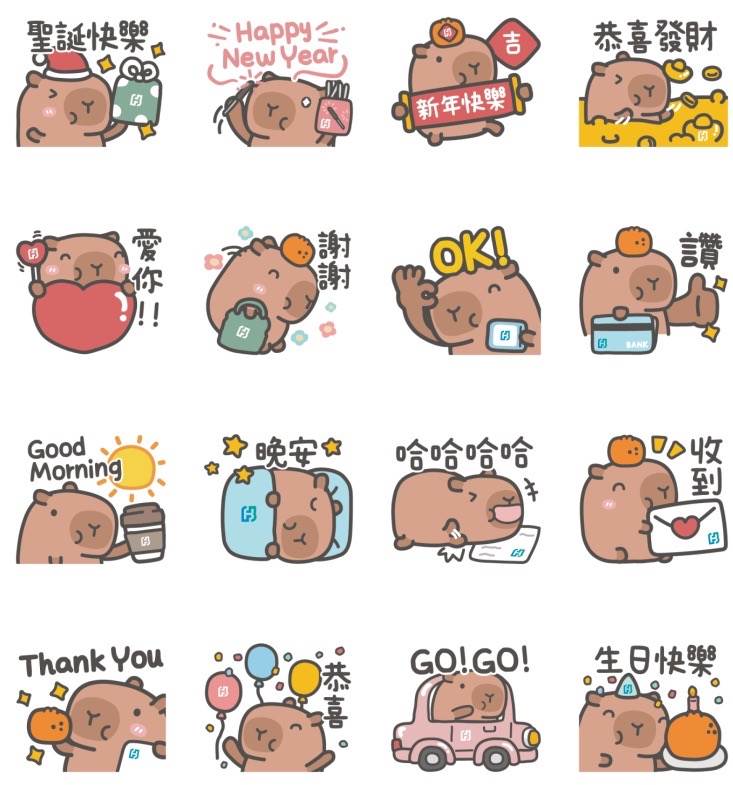 富邦與胖水豚聯名免費貼圖。(圖/翻攝自LINE貼圖)