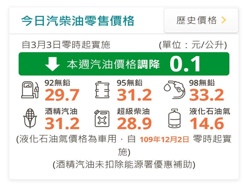 台灣中油表示,本週國際油價下跌,浮動油價調整原則調價指標7D3B週均價下跌1.83美元,新臺幣兌美元匯率貶值0.030元,跌幅為1.81%。按浮動油價機制調整原則,汽、柴油應調價格與本週參考零售價格相比,汽、柴油應各調漲0.7元及0.3元,惟為維持價格低於亞洲鄰近國家(日、韓、港、星),汽、柴油各吸收0.4元及0元,吸收後95無鉛汽油超出30元,啟動油價平穩措施,第一階段吸收25%調幅四捨五入,汽、柴油每公升各吸收0.4元。平穩雙機制啟動,汽、柴油各共吸收0.8元及0.4元,國內汽、柴油實際每公升價格各調降0.1元。