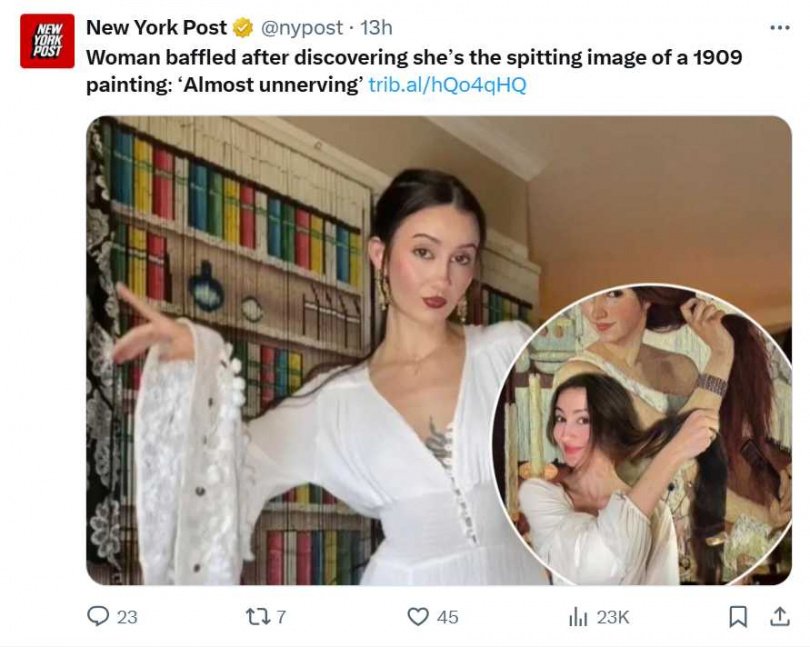 萊莉日前在短影音平台TikTok發布一支短片,有許多粉絲向她表示自己的外貌和一幅100多年前的畫作女主角相似,包括連髮型、睡衣款式等部分幾乎一模一樣。萊莉表示,她原先並不以為意,但隨著越來越多人跟她分享,她決定親自確認,而對於搜尋結果讓她震驚不已。