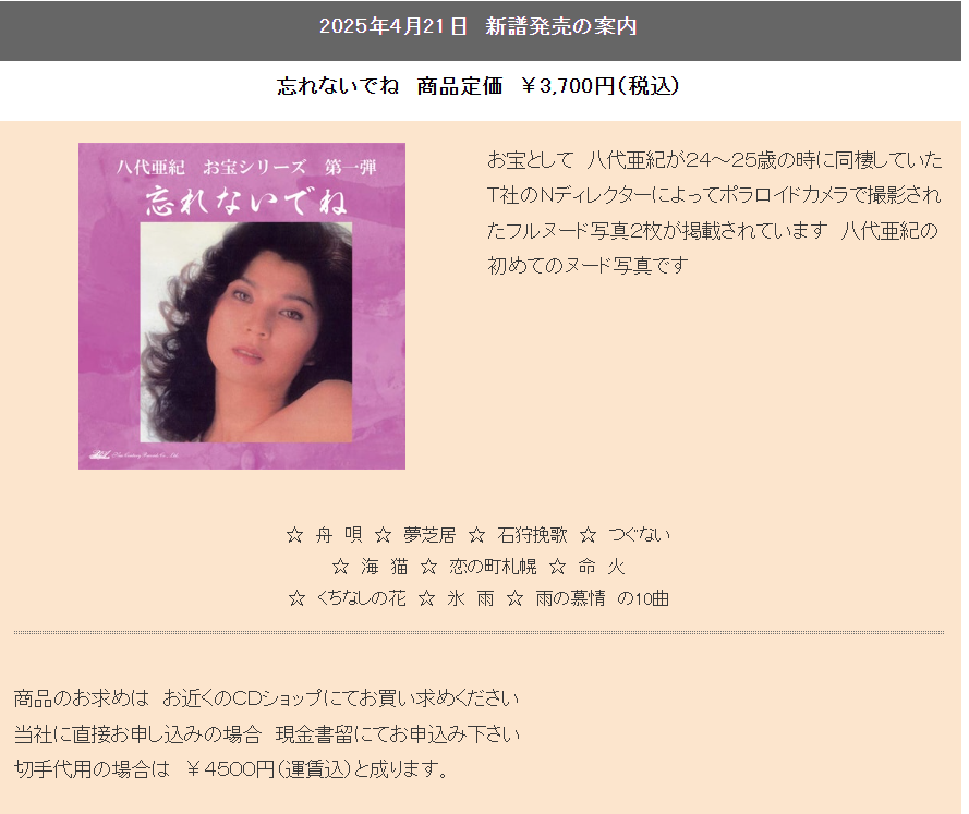 根據日媒報導,八代亞紀悼念專輯由唱片公司「New Century Records」發行,購買專輯贈送的「特典」居然是八代年輕時拍攝的2張全裸照片。唱片公司官網指出,照片是八代亞紀24-25歲時,與導演男友同居時所拍攝。
