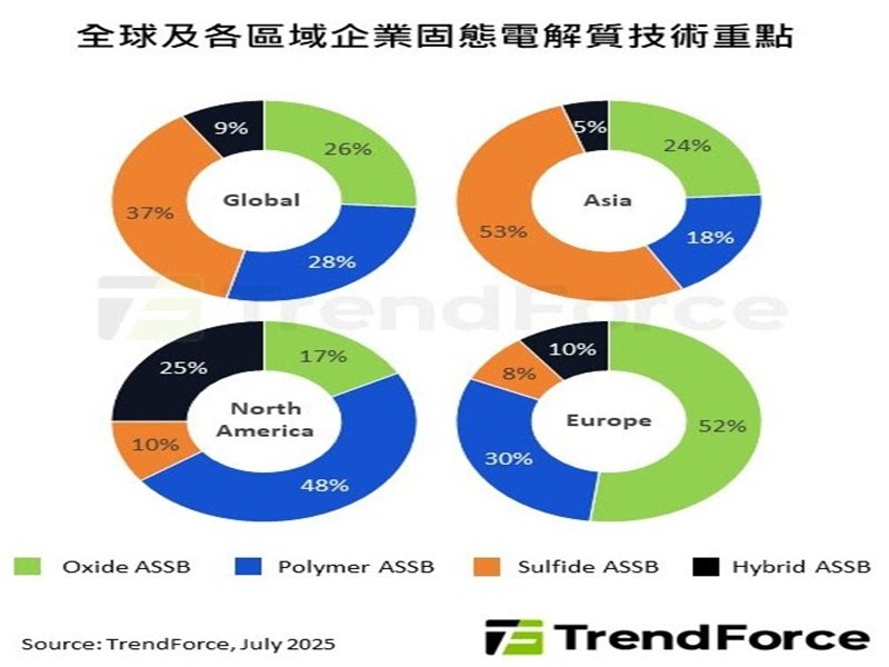 TrendForce數據顯示,亞洲地區半數以上企業固態電池設計方案傾向選擇以硫化物為主體固態電解質,如Toyota、Honda、Samsung SDI、LGES、SK On,以及CATL、BYD、Gotion等領先製造商均重點佈局此技術路線。北美和歐洲地區也出現許多新創企業,包括QS、Solid Power、Factorial Energy、ilika、Adden Energy和Basquevolt,技術路線主要為聚合物和氧化物固態電解質。