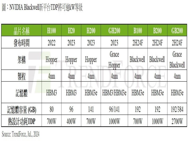 TrendForce表示,server晶片的熱設計功耗(Thermal Design Power,TDP)持續提高,如B200晶片的TDP將達1,000W,傳統氣冷散熱方案不足以應付需求;GB200 NVL36及NVL72整機櫃的TDP甚至將高達70kW及近140kW,需要搭配液冷方案方以有效解決散熱問題。