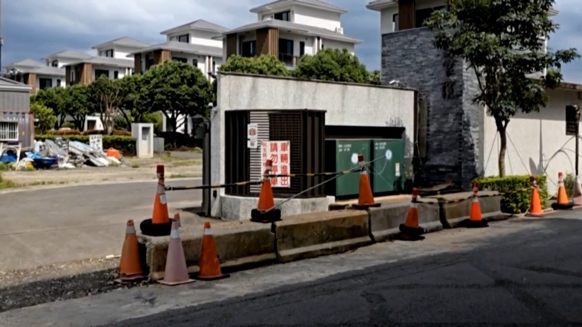 社區大門口擺起石墩,上頭還擺交通錐,住戶車輛進出,得小心翼翼避開石墩,只是社區裡,一棟棟漂亮透天厝,門口怎麼是這般破破碎碎的模樣,還有障礙物。一個多月來,車輛進出都被影響,讓裡面13戶住戶也擔心,社區住戶:「現在擋這些東西,萬一我們裡面有什麼事情,不管消防車救護車,你根本不能過。」