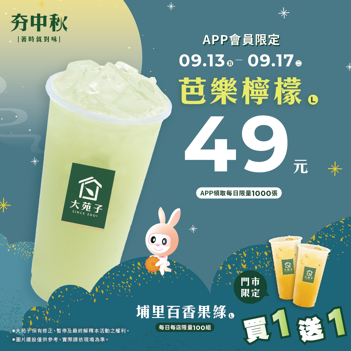 為了慶祝中秋節到來,大苑子推出優惠,即日起至9月17日,APP會員專屬「芭樂檸檬49元優惠券」,每日限量1000張,活動期間內每人限領1張,量有限領完為止,且需再領取日當天使用完畢。