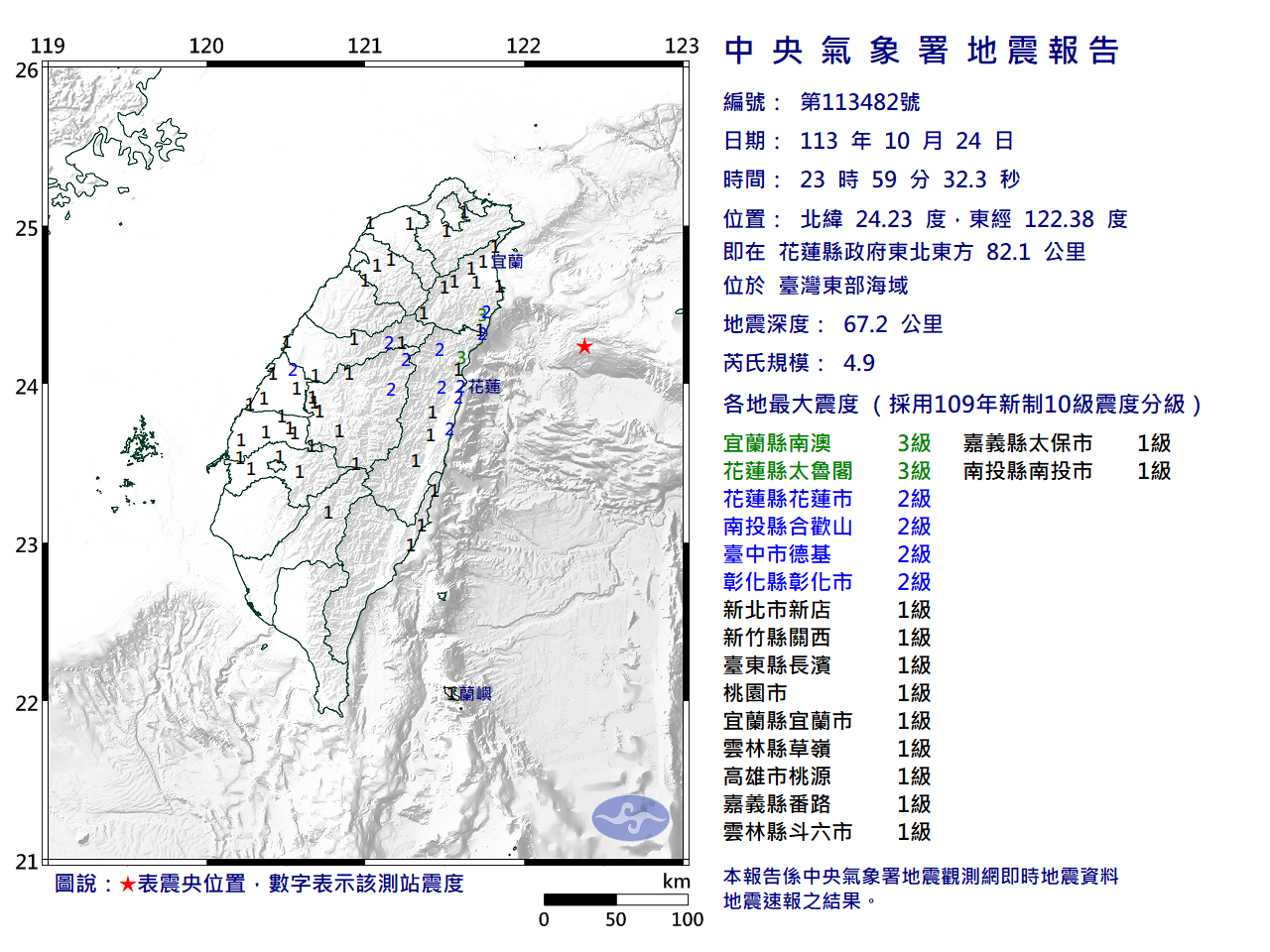中央氣象署發布顯著有感地震最新消息,今(24)日23時59分,發生芮氏規模4.9有感地震,震央位置在花蓮縣政府東北東方 82.1 公里 (位於臺灣東部海域),震源深度67.2公里。